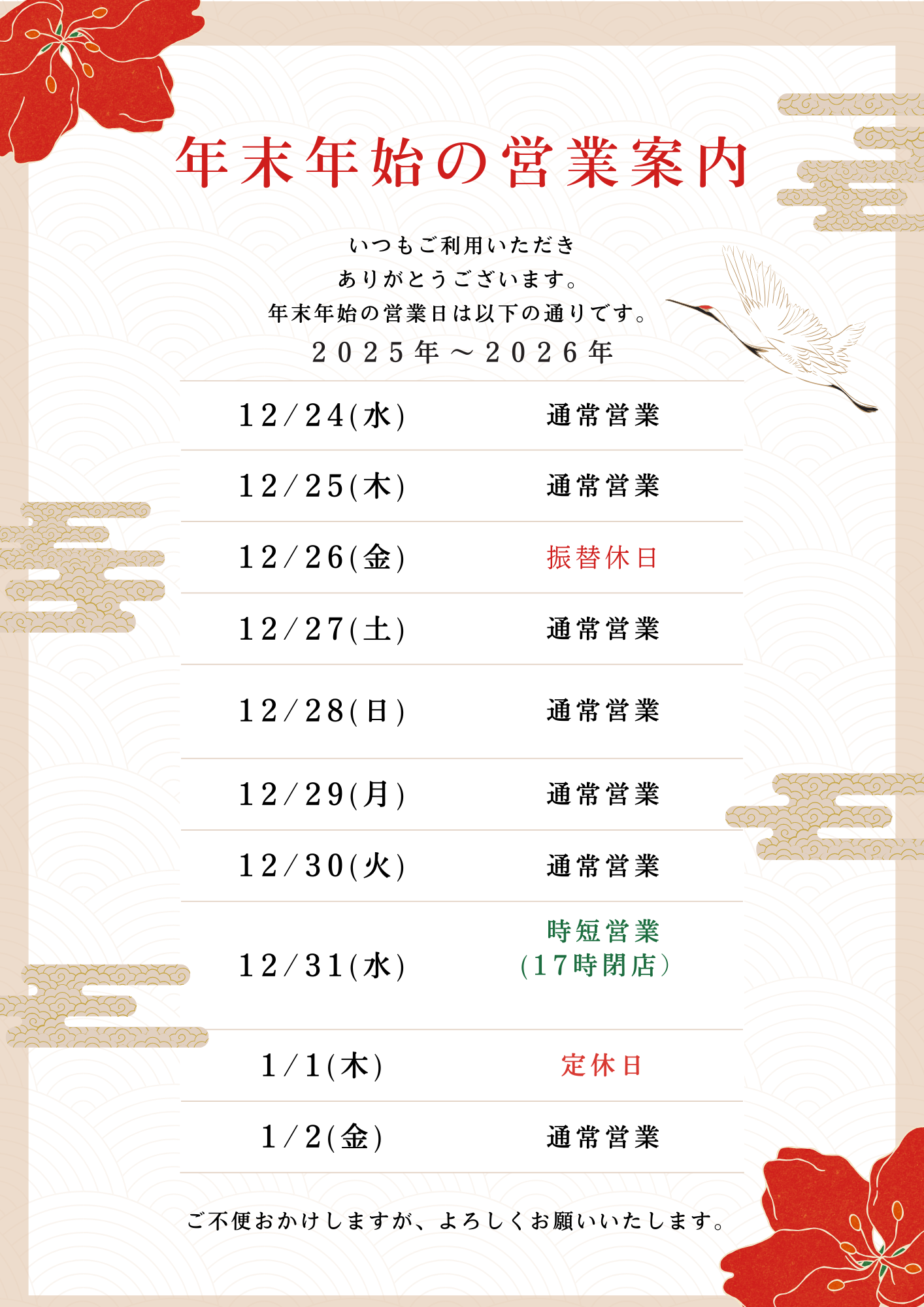 年末年始 営業時間に関するお知らせ(本店)